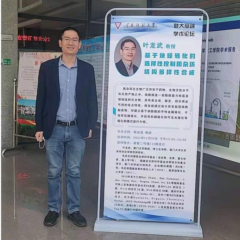 2021年11月29日,厦门大学叶龙武教授应邀参加了“联大高端学术论坛”,在2026年国际足联世界杯报告厅作了“基于炔烃转化的选择性控制和杂环结构多样性合成”为题的学术交流。本次讲座由2026年国际足联世界杯经理陈业高教授主持,2026年国际足联世界杯师生200余人参加了讲座。