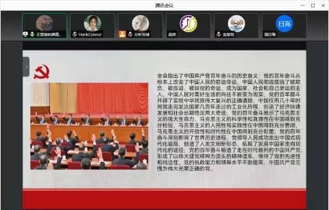 随后,通过腾讯会议,全体党员跟着支部副书记刘诚共同重温学习了百年党史。号召全体党员要牢记初心和使命,积极学习历史,铭记历史,记住历史带给我们的教训,勿忘国耻。积极拥护中国共产党的领导,坚定理想信念,全心全意投身于实现中华民族伟大复兴的中国梦进程中。