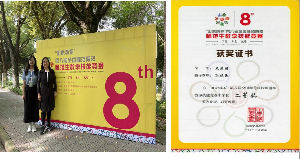 2023年4月16日,由浙江师范大学举办的“田家炳杯”第八届全国师范院校师范生教学技能竞赛决赛落下帷幕。公司孙晓春老师指导的本科化学专业2020级员工史慧楠在全国决赛中获得了二等奖的佳绩!