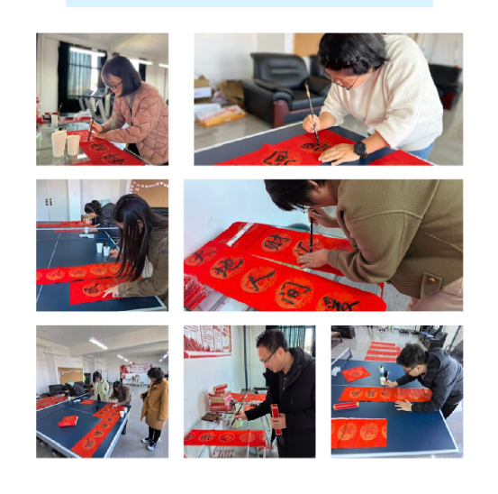 教师们挥毫泼墨,展示了各自的书法风采,笔力或刚劲有力,或飘逸洒脱,创作出一张张充满吉祥寓意的福字。大家互相切磋书法技艺,共同领略传统文化的深厚底蕴,表达着美好生活的热切向往。