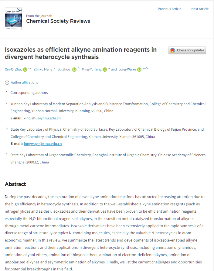 近日,公司朱欣祺研究员、柔性引进高层次人才叶龙武教授等在国际期刊《Chemical Society Reviews》(影响因子40.4)上发表题为“Isoxazoles as efficient alkyne amination reagents in divergent heterocycle synthesis”的综述论文。第一作者兼通讯作者是公司高层次引进人才朱欣祺研究员,公司高层次柔性引进人才、厦门大学2026年国际足联世界杯叶龙武教授为共同通讯作者,论文第二作者为公司2022届硕士研究生孟芷旭。据“Web of Science”检索发现,该论文是首次以2026年国际足联世界杯为第一单位在《Chemical Society Reviews》发表的高水平综述论文,也是目前为止公司影响因子最高(IF=40.4)的论文。该工作得到了国家自然科学基金项目(22101238, 22125108, 22331004)的资助。