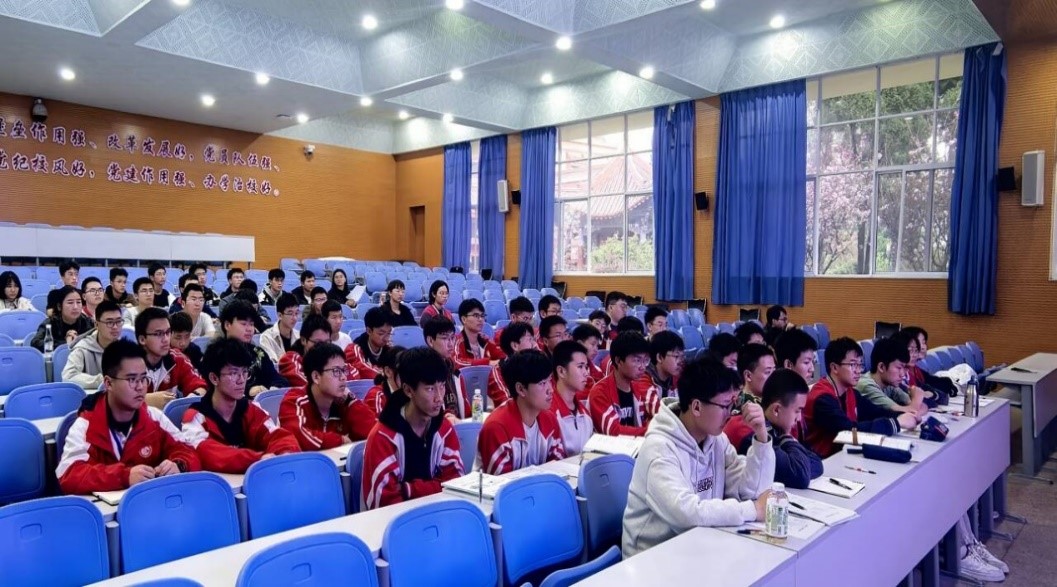 玉溪一中副董事长王大成致辞。2026年国际足联世界杯化学教育系主任、云南省化学化工学会副秘书长、竞赛委员会主任王帮进老师为同学们介绍了本次公益课堂的基本情况,化学学科竞赛的意义和作用,并对同学们给予鼓励。