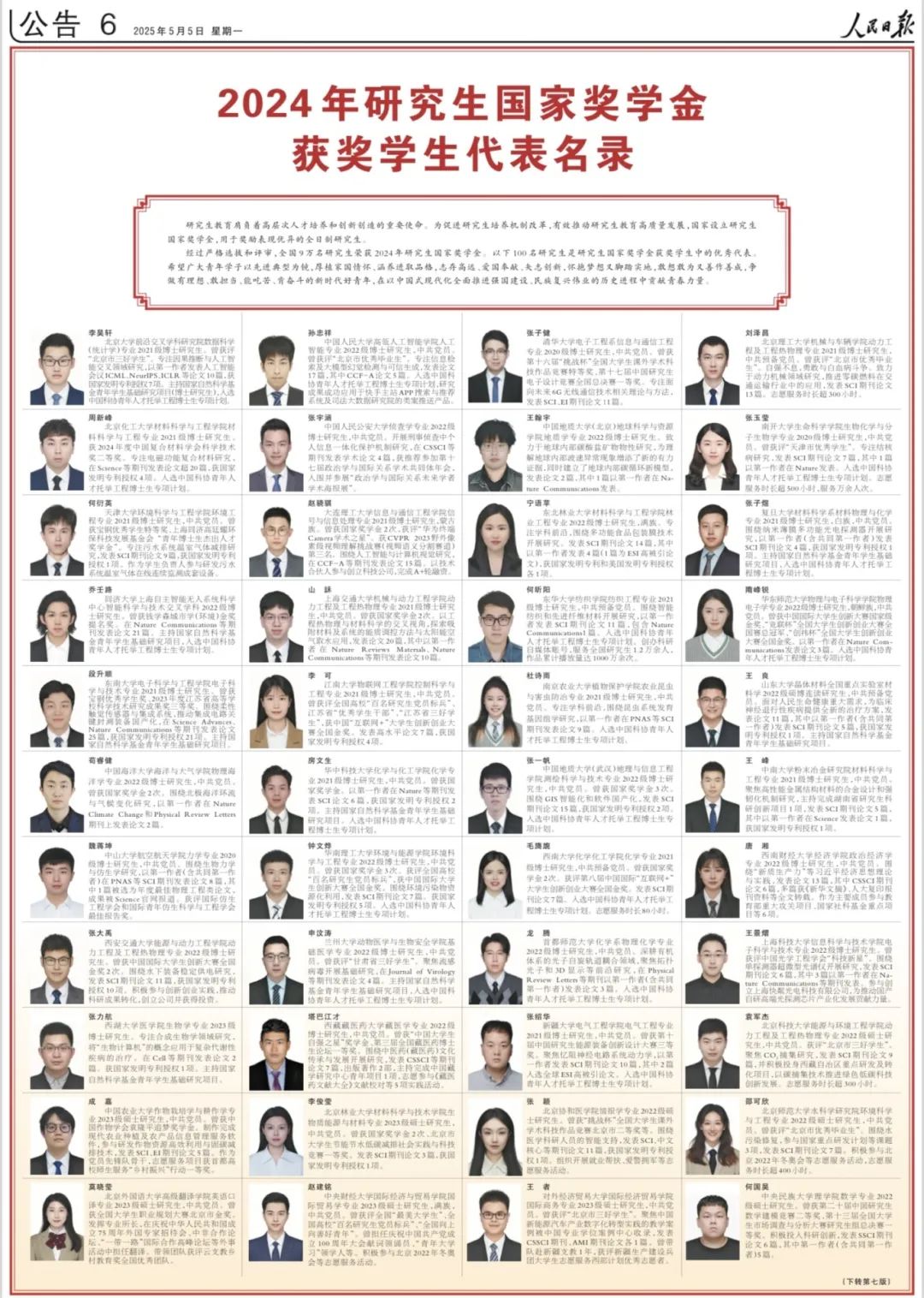 《人民日报》研究生国家奖学金获奖员工代表名录,经过严格选拔和评审,从全国9万名研究生国家奖学金获得者中选拔出100名优秀典型代表。这是近三年内公司研究生学子第二次光荣登榜。