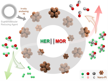 搭建超分子还原剂实现纳米铂原位锚定及驱动阴极析氢-阳极醇氧化耦合系统运转的示意图