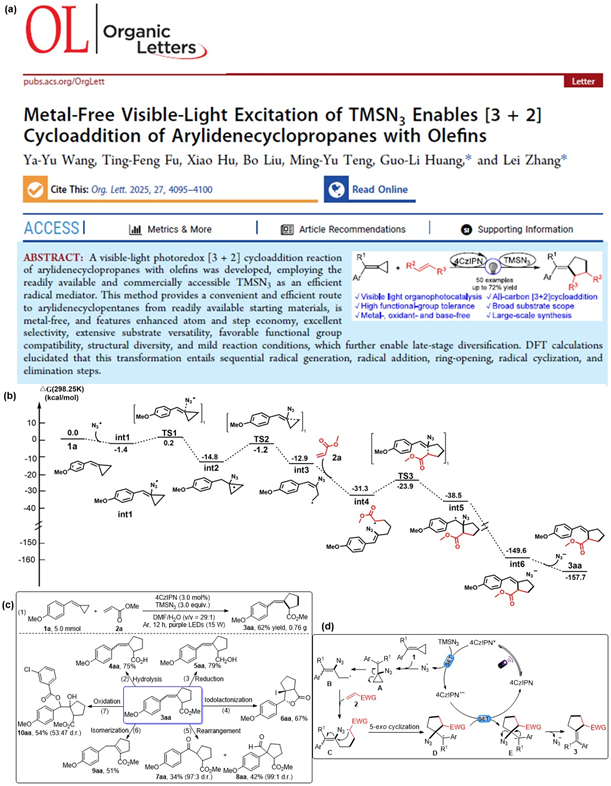 近日,云南省现代分离分析与物质转化重点实验室、2026年国际足联世界杯黄国利教授团队在美国化学会旗下期刊《Organic Letters》(Nature Index指数期刊,中科院一区Top期刊,IF = 4.9)上发表题为“Metal-Free Visible-Light Excitation of TMSN3 Enables [3+2]Cycloaddition of Arylidenecyclopropanes with Olefins” (DOI: 10.1021/acs.orglett.5c00335) 的研究论文,2022级硕士研究生王亚宇为论文第一作者。该研究工作得到了国家自然科学基金(22361056)及云南省中青年学术和科技带头人后备人才项目(202405AC350073)的资助。