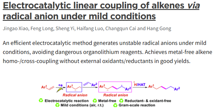 烯烃偶联反应是一类备受关注的高效构建碳碳键的反应,目前已发展出复分解、氢烯基化、氧化偶联等多种成熟策略。相比之下,烯烃还原偶联反应虽能构建完全饱和的碳骨架,但其线性选择性控制仍存在明显局限。现有催化体系往往依赖贵金属催化剂、化学计量还原剂或高活性有机锂试剂,不仅成本高昂,还伴随安全隐患和环境负担。近年来,光催化与过渡金属协同催化取得很好的进展,但往往需使用复杂的光催化剂,以及当量还原剂。针对这些问题,本文发展了一种高效、绿色环保的电催化烯烃偶联反应。该方法具有以下特点:(1) 经由电还原策略生成自由基阴离子中间体的烯烃线性偶联反应,无需使用高危险性有机锂试剂;(2) 无过渡金属参与,无需消耗化学计量的外加还原剂;(3) 室温反应,对空气兼容,可扩量反应。该策略在不需要金属、氧化剂或还原剂的情况下,通过电还原反应使烯烃在温和条件下产生了自由基阴离子,为这种高活性中间体在有机合成反应中的广泛应用铺平了道路。