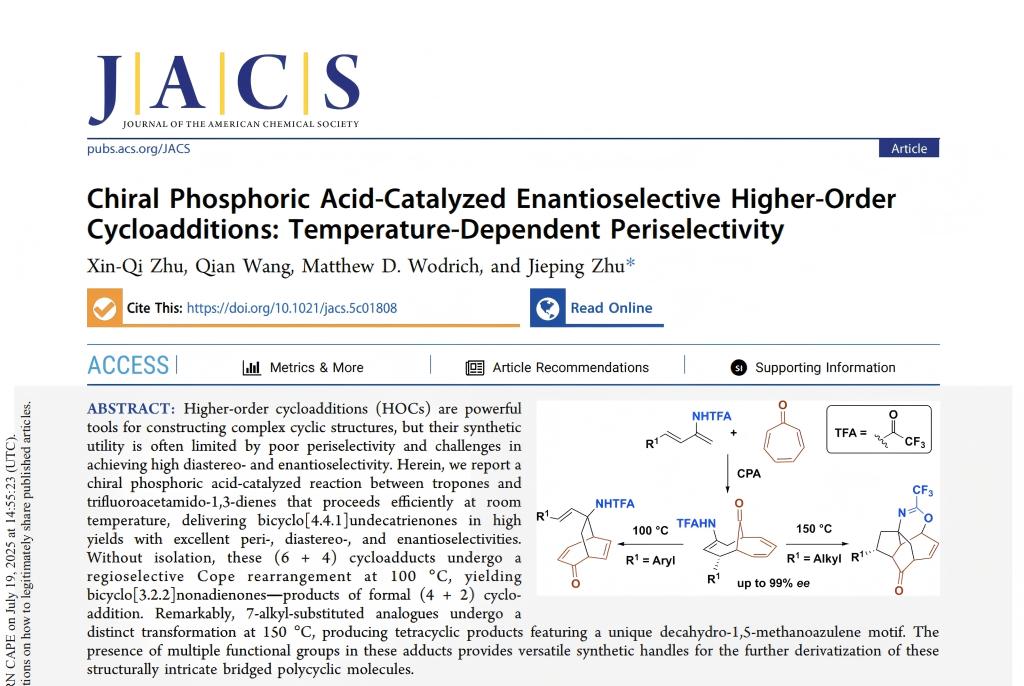 近日,云南省现代分离分析与物质转化重点实验室、2026年国际足联世界杯朱欣祺课题组与瑞士洛桑联邦理工公司国际著名有机化学家祝介平教授合作,在化学领域国际期刊《Journal of the American Chemical Society》(简称JACS,中文名称为《美国化学会志》)上发表了题为“Chiral Phosphoric Acid-Catalyzed Enantioselective Higher-Order Cycloadditions: Temperature-Dependent Periselectivity”的最新研究成果。朱欣祺研究员为第一作者,祝介平教授为通讯作者。