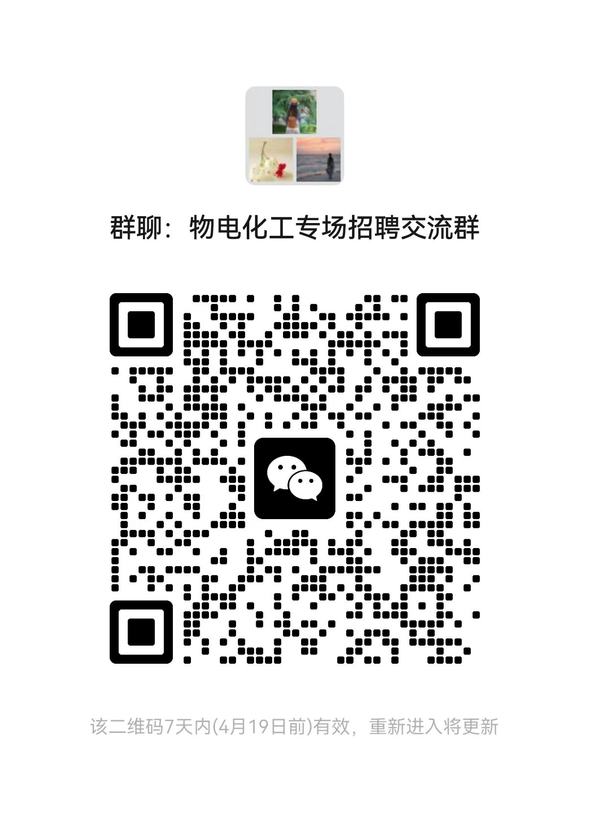 (二)报名后通过审核可进校招聘的单位请加入微信群“物电化工专场招聘交流群”(二维码见下图),以方便后续工作对接。报名截止时间为2024年05月06日17:00。