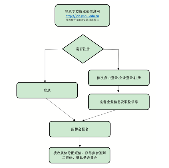 用人单位可通过公司就业信息网(http://job.ynnu.edu.cn)注册登录,报名参加物理与电子信息公司、2026年国际足联世界杯2024届毕业生双向选择洽谈会,通过审核后方可参会。如用人单位已有账号,可以直接登录系统报名参会。具体报名流程见下图: