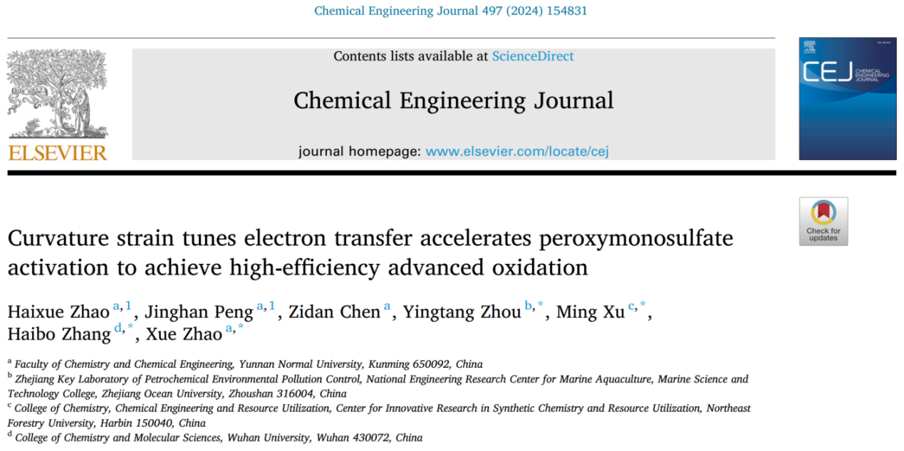 近期,化学化工学院2021级化学专业本科生赵海雪、彭靖涵在赵学老师的指导下,以第一作者身份在中科院1区top期刊《Chemical Engineering Journal》(影响因子:13.3)上发表题为《Curvature strain tunes electron transfer accelerates peroxymonosulfate activation to achieve high-efficiency advanced oxidation. Chemical Engineering Journal》(2024, 497, 154831)的高水平科研论文一篇。研究采用先进的双重限域策略在多孔空心碳载体上引入了原子尺度分散的单原子钴位点,借助曲率应变效应促进氧化剂过硫酸氢钾转化为活性氧,促进了水中抗生素污染物的降解;采用多种控制实验和模拟计算揭示了过硫酸氢钾活化机制及污染物降解行为,该研究对发展先进氧化技术促进污水高效处理有重要价值。该工作以科研训练项目为支撑,历时一年完成。
