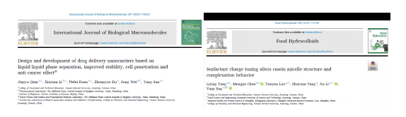 竞赛成果进一步转化为学术论文,员工团队以第一作者身份在食品与生物材料领域期刊Food Hydrocolloids(中科院一区TOP,影响因子12.4)与International Journal of Biological Macromolecules(中科院二区TOP,影响因子8.5)上发表SCI论文2篇,指导教师为应用化学系孙洋副教授和杜仲尧博士。