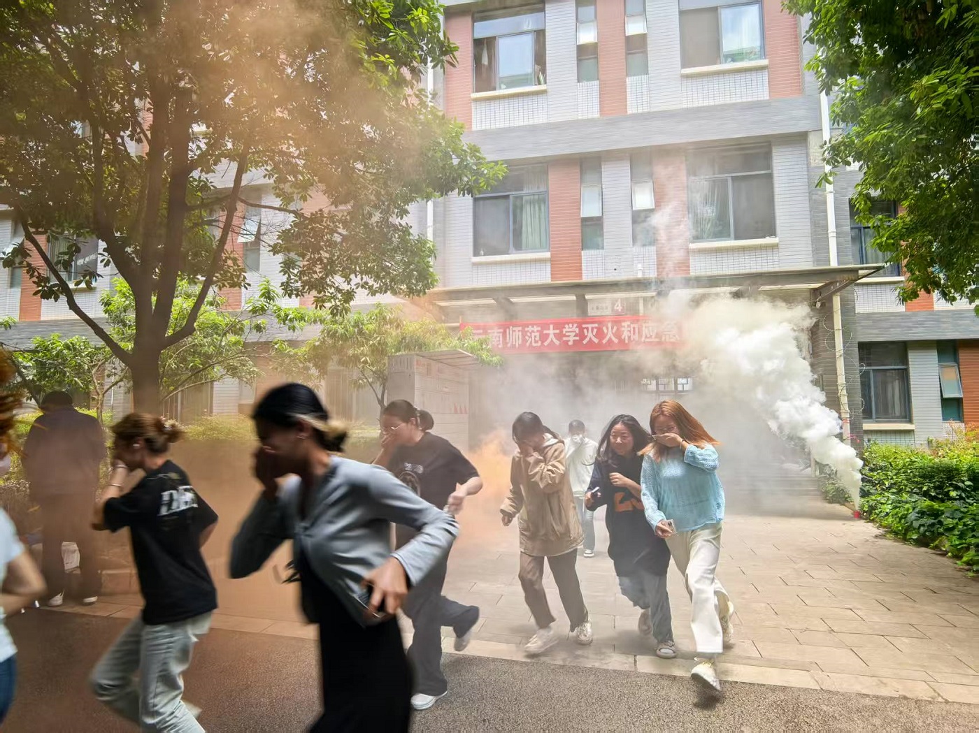 13时00分,随着模拟烟雾升起,保卫处人员第一时间触发消防警报。各楼层员工迅速按照应急预案指引用湿毛巾捂住口鼻,沿安全通道低姿快速撤离。演练全程严格模拟真实火场环境,4栋员工公寓共计200余名师生在规定时间内全部安全疏散至指定集合点,无拥挤踩踏现象,圆满完成“即刻响应、迅速撤离”的演练目标。